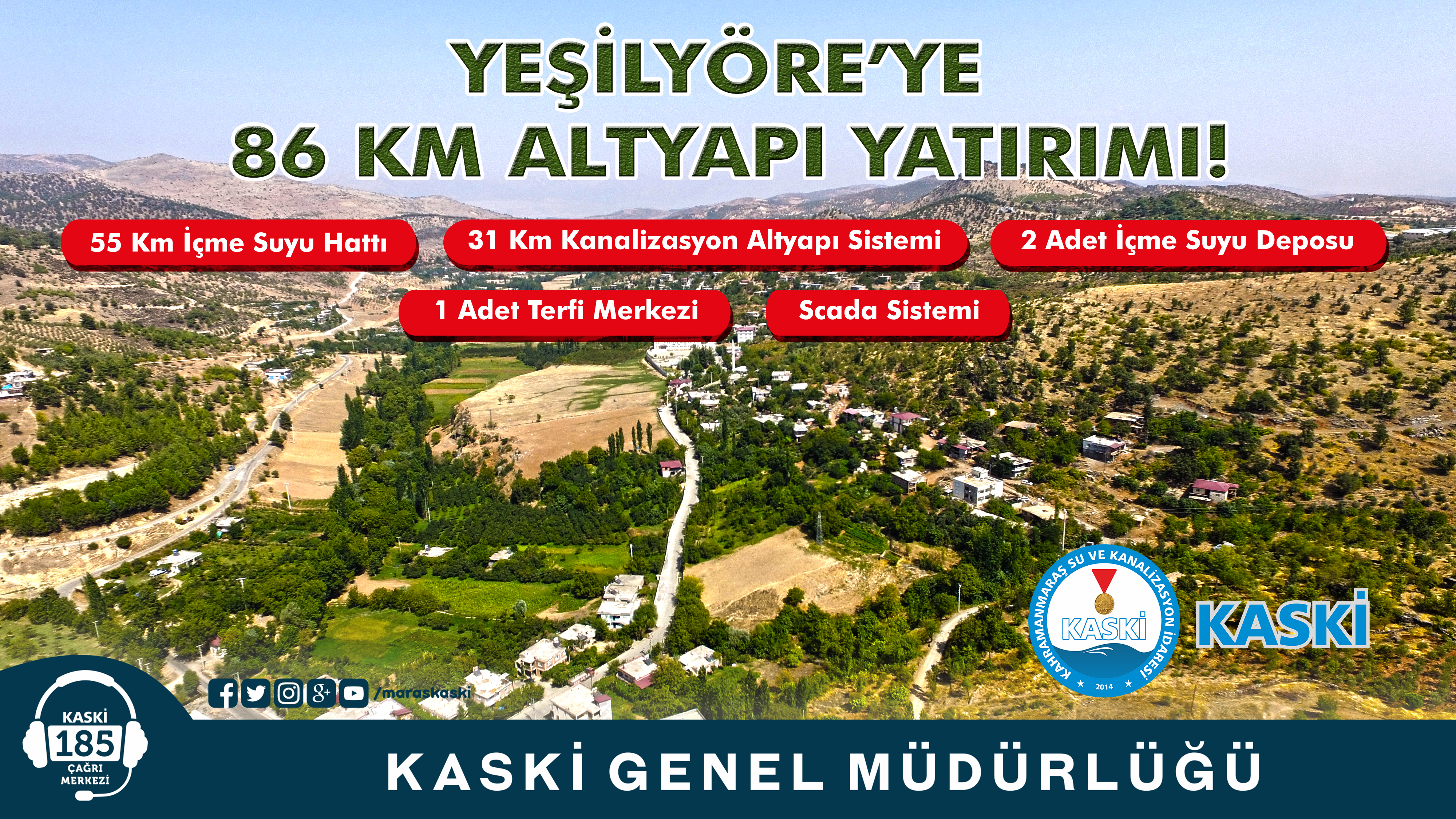 Eski Belde Belediyelerinden olan ve yerleşimin yoğun olduğu mahallede içme suyu şebekesinin kullanılamaz hale gelmesi üzerine KASKİ Genel Müdürlüğü mahallede altyapı çalışması yapılması için harekete geçti. Yeşilyöre Mahallesinde proje kapsamında toplam 55 km içme suyu hattı yapımına başlandı. İçme suyu çalışmaları kapsamında yaklaşık 8,5 km isale ve terfi hattı yapımı, 46,5 km şebeke hattı yenilemesi, 300 ve 500 m³’lük olmak üzere 2 adet yeni içme suyu deposu, 1 adet terfi merkezi ile vana, vantuz, tahliye, basınç kırıcı odalar, debimetre odası, yangın muslukları gibi sanat yapıları yer alıyor. Ayrıca projeyle scada sistemi de kurulacak ve şebekenin her türlü kontrolü bu sistemle sağlanacak. Sistem sayesinde kayıp kaçak oranı minimize edilecek ve kimyasal parametrelerin (Ph, Klor, Bulanıklık) SCADA merkezinden kontrolüyle mahalleye kesintisiz sağlıklı içme suyu sağlanacak.