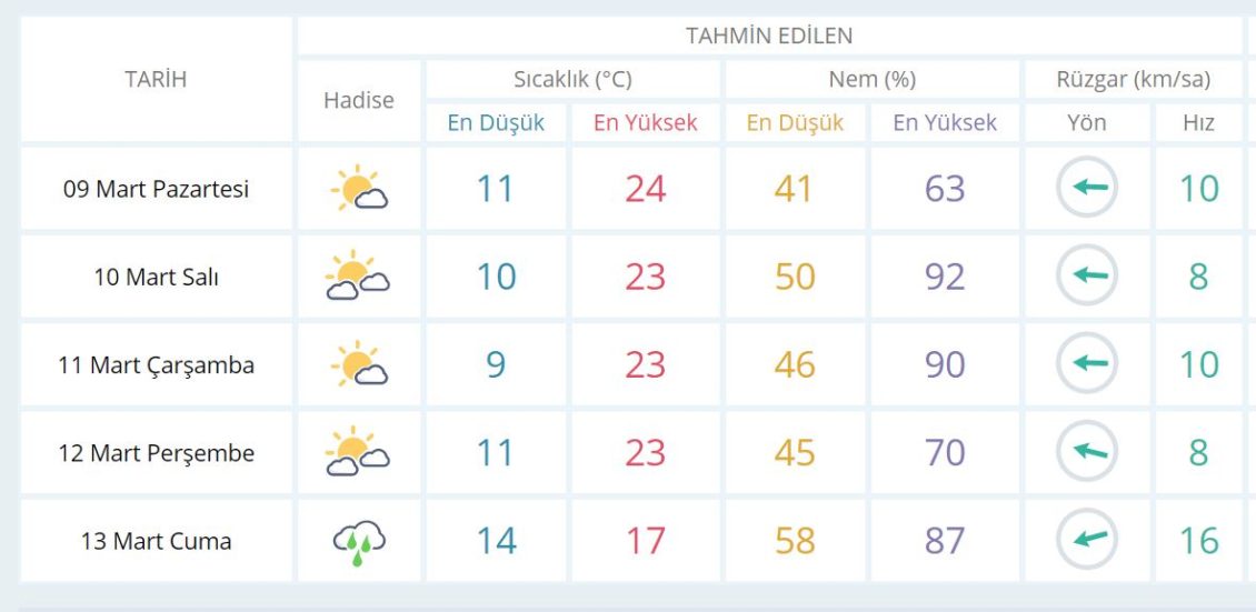 9 Mart Pazartesi günü en düşük sıcaklık 11 derece, en yüksek sıcaklık ise 24 derece açık olacak.