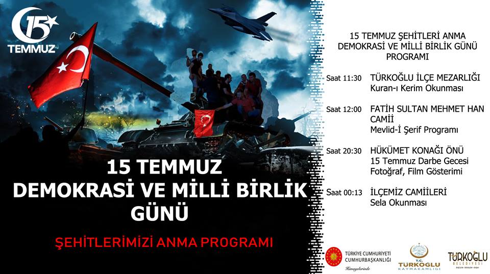 Türkoğlu ilçesinde 15 Temmuz Şehitleri Anma, Demokrasi ve Milli Birlik Günü kutlamasına ilişkin Türkoğlu Kaymakamlığı tarafından Programı yayınlandı.