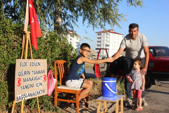 Aşık Mahzun-i Şerif Ortaokulu öğrencisi 11 yaşında ki Göktürk Bera Selimoğlu’nun Manavgat’ta ki Yangından etkilenenlere destek olmak amacıyla başlattığı bu girişim Mahalle halkından ve yoldan geçenlerden de büyük destek gördü.