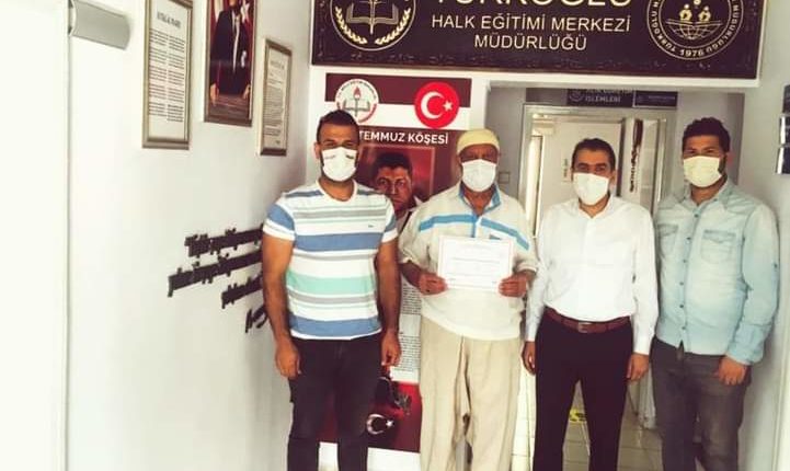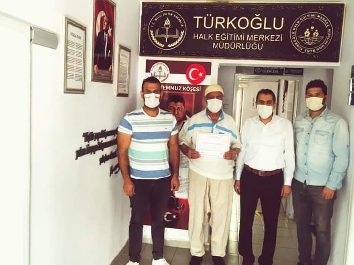 Türkoğlu Halk Eğitim Merkezi Müdürlüğü bünyesinde açılan okuma yazma kursuna katılan 80 yaşındaki Mustafa Gökkaya azmi ve kurs öğretmenlerinin desteği ile okuma yazmayı öğrendi. Kurs sonunda okuma yazması verilen Mustafa Gökkaya kurs öğretmenleri ile yetkililere teşekkür etti.
