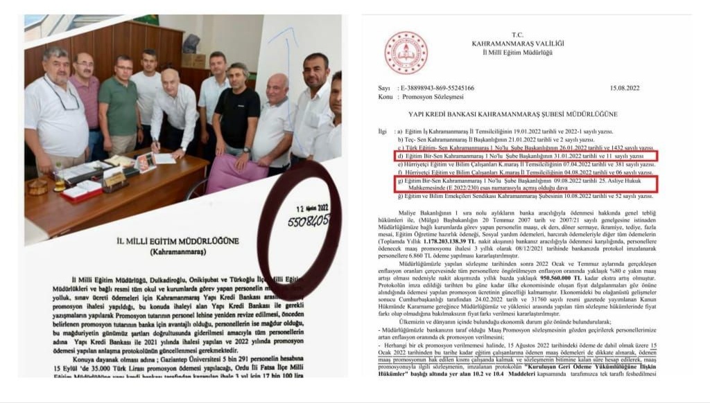 Kahramanmaraş Eğitim Bir Sen 1 nolu şube başkan adayı Adem Aydoğan ın Eğitim çalışanlarının maaş promosyon anlaşmasının feshi için İl Milli Eğitim Müdürlüğüne teslim ettikleri dilekçeleri ile ilgili süreç, İl Milli Eğitim Müdürlüğünün yetkili banka ile görüşmeye başlaması ile hızlandırılmıştır.