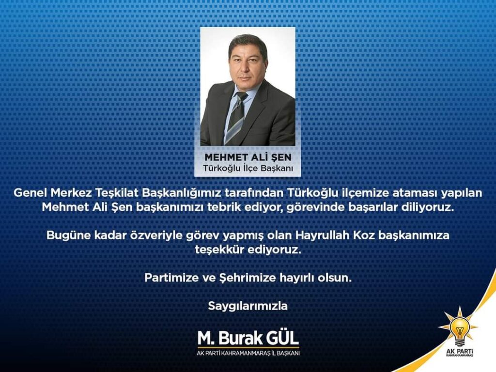 Ak Parti Kahramanmaraş İl Başkanlığından yapılan açıklamada: “Genel Merkez Teşkilat Başkanlığımız tarafından Türkoğlu ilçemize ataması yapılan Mehmet Ali Şen başkanımızı tebrik ediyor, görevinde başarılar diliyoruz.