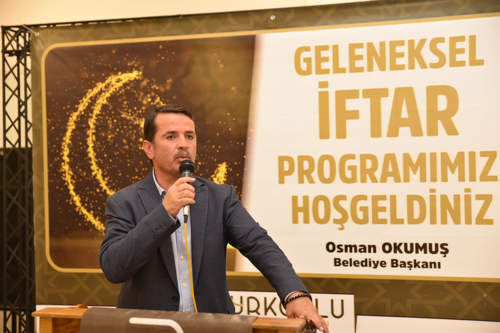 Türkoğlu Belediyesinin tüm kademelerinde özverili ve fedakarca çalışan personelleriyle birlikte büyük bir aile olduğunu ifade eden Başkan Okumuş, “Cenab-ı Allah’a binlerce kez şükürler olsun ki, yine huzur, barış ve güzellikler içerisinde mübarek Ramazan ayını hep birlikte idrak ediyoruz. Aynı hedef doğrultusunda birlikte mesai yaptığımız, birlikte yol yürüdüğümüz ve omuz omuza verip çalıştığımız personellerimiz ve aileleriyle birlikte iftar yapıyoruz. Rabbim yaptığınız ibadetleri, tuttuğunuz oruçları kabul etsin.