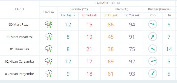 Ramazan Bayramı 1. günü 30 Mart Pazar günü en düşük sıcaklık 12 derece, en yüksek sıcaklık ise 15 derece yağmurlu olacak.