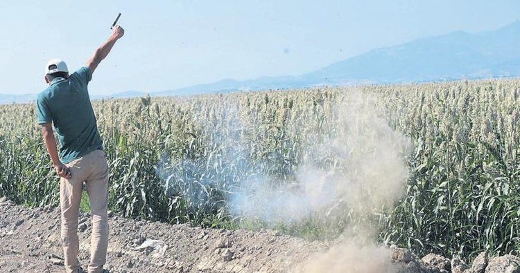Kahramanmaraş‘ın Türkoğlu ilçesinde çiftçiler, tarladaki beyaz darıları kuşlardan korumak için kendi yaptıkları “torpil tabancası”yla gece gündüz nöbet tutuyor.