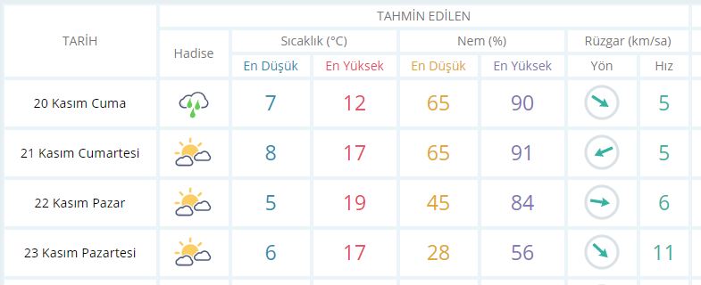 22 Kasım Pazar günü en düşük sıcaklık 5 derece, en yüksek sıcaklık ise 19 derece bulutlu olacak.