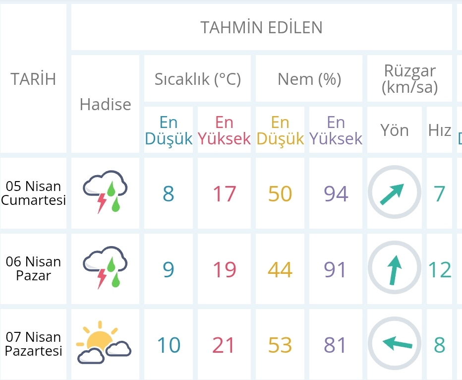 5 Nisan Cumartesi günü en düşük sıcaklık 8 derece, en yüksek sıcaklık ise 17 derece yağışlı olacak.