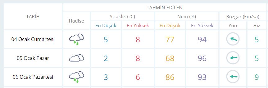 4 Ocak Cumartesi günü en düşük sıcaklık 5 derece, en yüksek sıcaklık ise 8 derece güneşli parçalı bulutlu olacak.