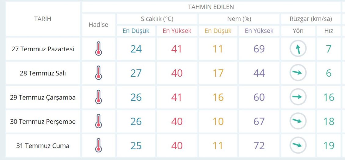 27 Temmuz Pazartesi günü en düşük sıcaklık 24 derece, en yüksek sıcaklık ise 41 derece sıcak olacak.
