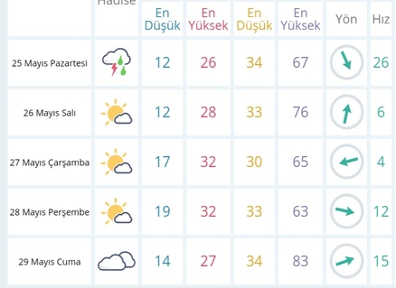 25 Mayıs Pazartesi günü en düşük sıcaklık 12 derece, en yüksek sıcaklık ise 26 derece yağışlı olacak.