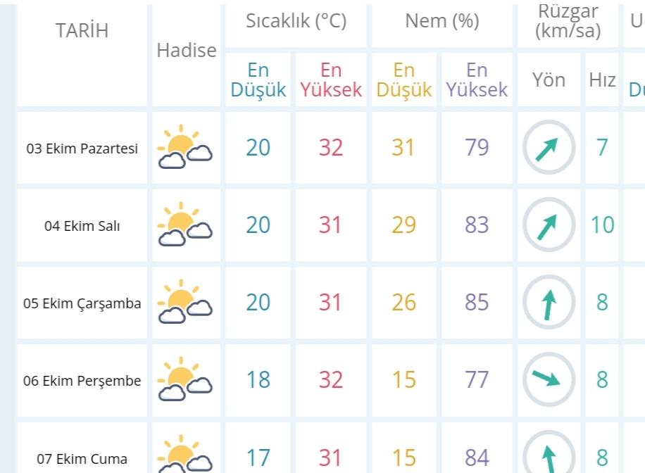 5 Ekim Çarşamba günü en düşük sıcaklık 20 derece, en yüksek sıcaklık ise 31 derece açık az bulutlu sıcak olacak.
