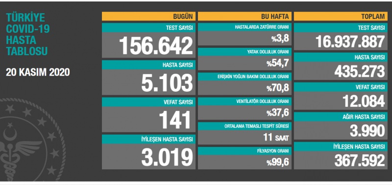 Sağlık Bakanı Fahrettin Koca, 20 Kasım koronavirüs tablosuna ilişkin yaptığı açıklamada, ”Bugün tespit edilen 5.103 yeni hastamız var. Ağır hasta sayımız 4.000’e yaklaştı. Salgınla mücadelede yeniden kısıtlamalar uygulamak zorunda kaldık. Birlikte tedbirlere uyarsak kendi kısıtlamalarımızı kendimiz koyarsak mücadele daha kolay olacak. Güç verin” ifadelerini kullandı.