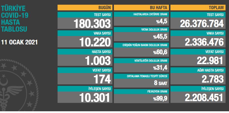 Sağlık Bakanlığı tarafından 11 Ocak koronavirüs tablosu, vaka, hasta, test, vefat sayısı ve son durum açıklandı.
