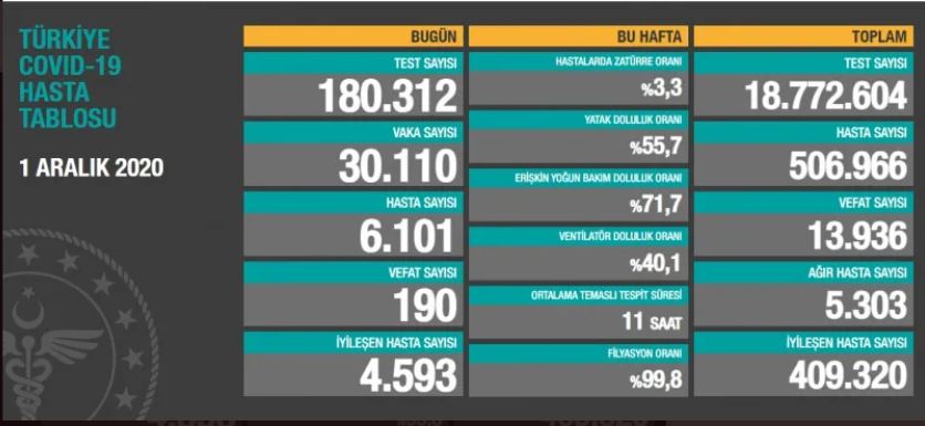 Sağlık Bakanı Fahrettin Koca, 1 Aralık koronavirüs tablosuna ilişkin, ”Bugün tespit edilen 6.101 yeni hastamız var. İyileşen hasta sayımız yeni hasta sayımızı geçmedikçe sağlık sisteminin yükü artmaya devam ediyor. İster zorunlu olsun isterse gönüllü tedbirlerin hayat kurtardığını unutmayalım. Tedbirlere uyalım.” ifadelerini kullandı.