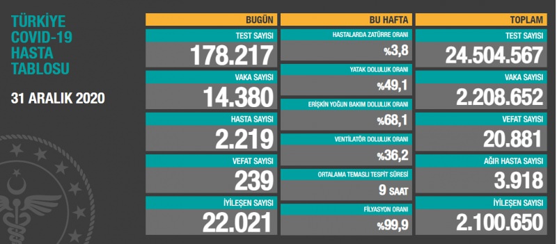 Türkiye’de son 24 saatte 178 bin 217 Kovid-19 testi yapıldı, 14 bin 380 kişinin testi pozitif çıktı, 239 kişi hayatını kaybetti.