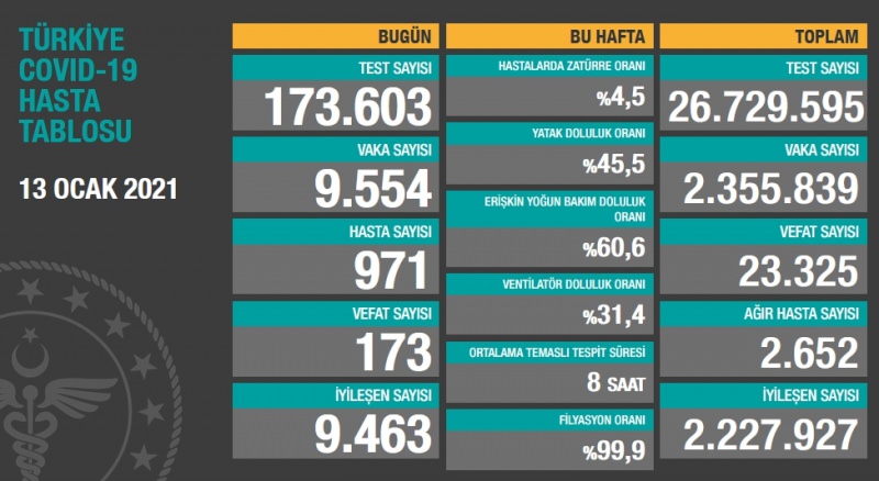 Sağlık Bakanlığı tarafından 13 Ocak koronavirüs tablosu, vaka, hasta, test, vefat sayısı ve son durum açıklandı.