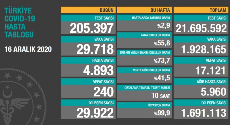 Sağlık Bakanlığı tarafından 16 Aralık koronavirüs tablosu, vaka, hasta, test, vefat sayısı ve son durum açıklandı. Türkiye’de son 24 saatte 206 bin 397 Kovid-19 testi yapıldı, 29 bin 718 kişinin testi pozitif çıktı, 240 kişi hayatını kaybetti. Bakan Koca tabloyla ilgili ‘Bugün uzun bir aradan sonra ilk defa günlük iyileşen sayısı yeni vaka sayısını geçti.’ dedi.