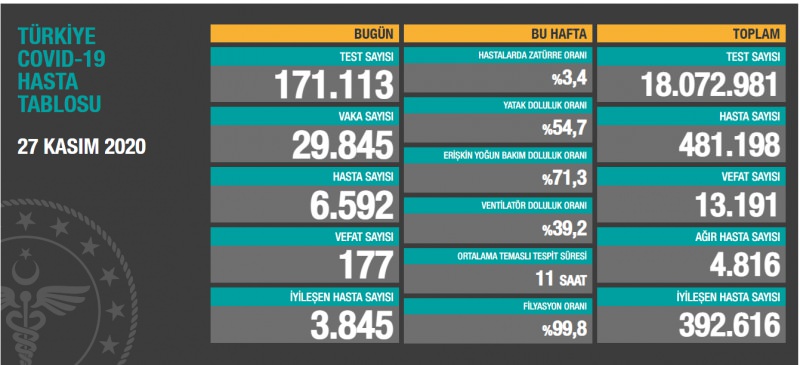 Sağlık Bakanı Fahrettin Koca, 27 Kasım koronavirüs tablosuna ilişkin yaptığı açıklamada, ”Bugün tespit edilen 6.592 yeni hastamız var. Ağır hasta sayımız 5.000’e yaklaştı. Kayıplarımız artıyor. Tedbirlere sıkı uyarsak kısıtlama olmadan da mücadele edebiliriz. Yoksa kısıtlamalar kaçınılmaz olur. En güvenli yer evimizdir.” ifadelerini kullandı