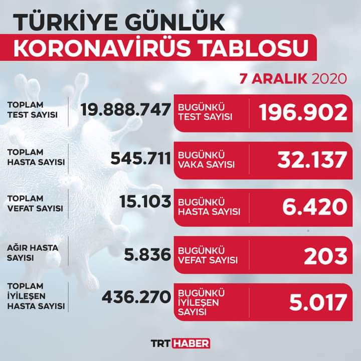 Türkiye Günlük Koronavirüs Tablosu, “covid19.saglik.gov.tr” adresinden paylaşıldı. Güncel verilere göre, son 24 saatte 196 bin 902 koronavirüs (Covid-19) testi yapıldı, 32 bin 137 kişinin testi pozitif çıktı, hasta sayısı 6 bin 420 oldu.