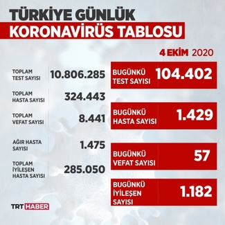 Toplam test sayısı 10 milyon 931 bin 917, hasta sayısı 326 bin 46, vefat sayısı 8 bin 498, ağır hasta sayısı 1412, aktif hasta sayısı 31 bin 178 oldu.