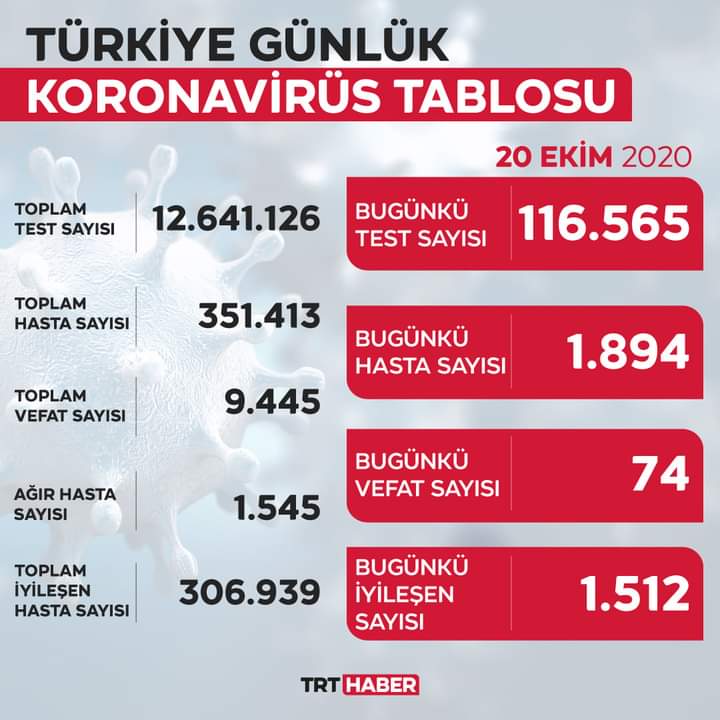 Toplam test sayısı 12 milyon 641 bin 126’ya ulaştı. Hasta sayısı 351 bin 413, vefat sayısı 9 bin 445, ağır hasta sayısı 1545, aktif hasta sayısı 35 bin 29 oldu.