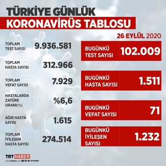 Toplam test sayısı 9 milyon 936 bin 581, vaka sayısı 312 bin 966, vefat sayısı 7 bin 929 olarak kayıtlara geçti.