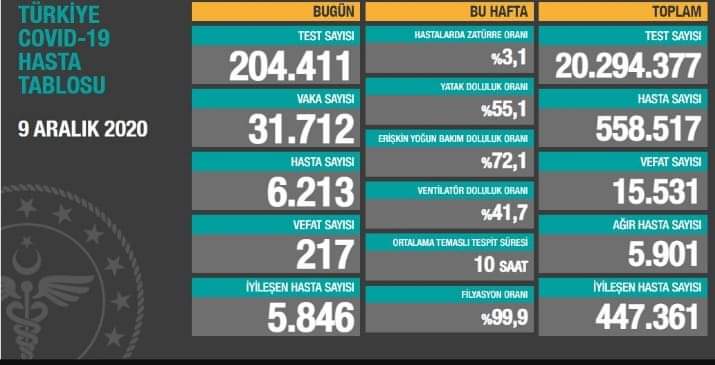 Sağlık Bakanlığı tarafından 9 Aralık koronavirüs tablosu, vaka, hasta, test, vefat sayısı ve son durum açıklandı. Türkiye’de son 24 saatte 204 bin 411 Kovid-19 testi yapıldı, 31 bin 712 kişinin testi pozitif çıktı, 217 kişi hayatını kaybetti. Ağır hasta sayısı 5 bin 901 oldu, son 24 saatte 5 bin 846 kişinin Kovid-19 tedavisinin tamamlanmasıyla iyileşenlerin sayısı 447 bin 361’e yükseldi.