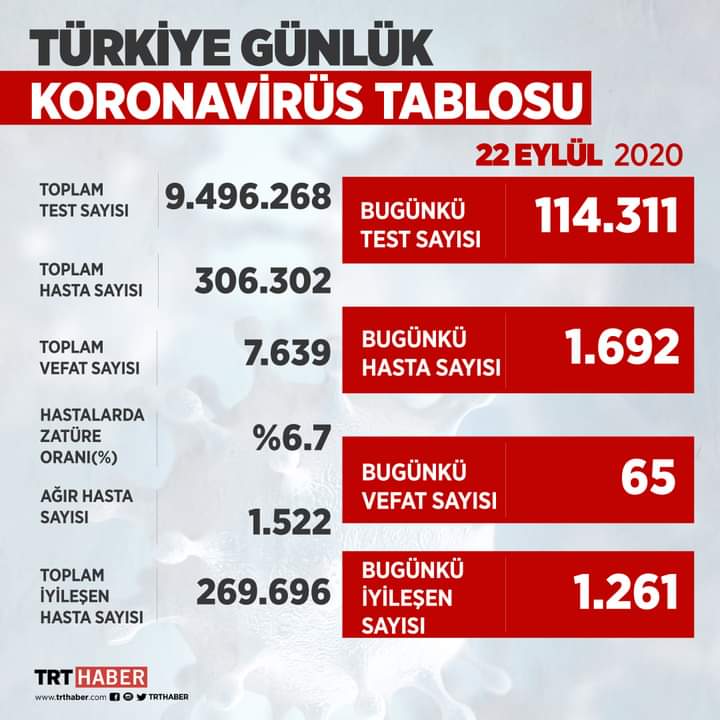 Toplam test sayısı 9 milyon 496 bin 268, vaka sayısı 306 bin 302, vefat sayısı 7 bin 639 olarak kayıtlara geçti.