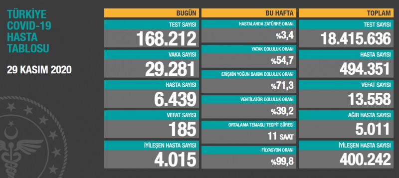 Sağlık Bakanı Fahrettin Koca 29 Kasım koronavirüs tablosuna ilişkin yaptığı açıklamada, ”Bugün 6.439 yeni hastamız var. Ağır hasta sayısı artmaya devam ediyor. Bu yükü başarıyla göğüsleyen sağlık çalışanlarımıza destek olun. Tedbirlere daha sıkı uyarak mücadeleye güç katın.” ifadelerini kullandı.