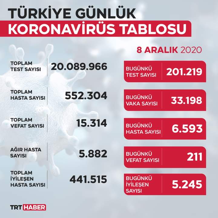 Sağlık Bakanı Fahrettin Koca 8 Aralık koronavirüs tablosuna ilişkin yaptığı açıklamada, ”Bugün tespit edilen 6.593 yeni hastamız var. Günlük test sayısında 200.000’e toplamda ise 20.000.000’a ulaştık. Ağır hasta sayımız artış hızı azalsa da 6.000’e yaklaştı. Kalabalıklardan uzak durmalı ve kendi kısıtlamalarımızı kendimiz uygulamalıyız.” ifadelerini kullandı.