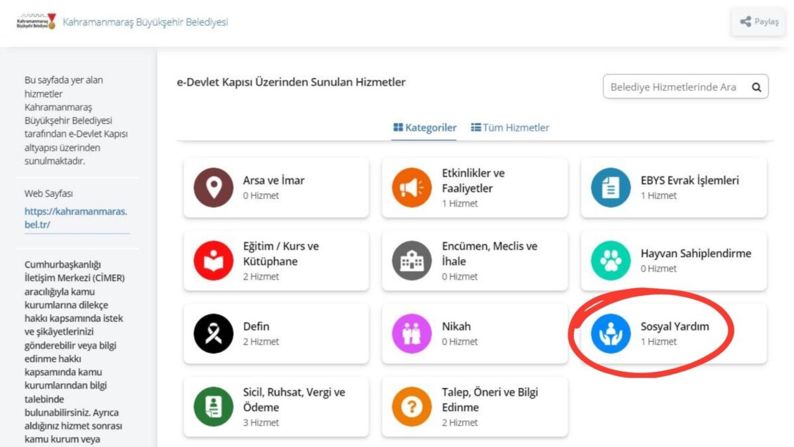 Kahramanmaraş Büyükşehir Belediyesi’nin e-Devlet üzerinden uygulamaya koyduğu 9. hizmet olan ‘Sosyal Yardım Ön Başvurusu ve Başvuru Sorgulama’ vatandaşların kullanımına açıldı. Uygulama üzerinden hizmetler kısmında belediye seçimi yapıldıktan sonra Kahramanmaraş Büyükşehir Belediyesi’nin sosyal yardım modülü seçilebiliyor. Açılan sayfada yeni başvuru kısmı işaretlenerek vatandaşlar kolay bir şekilde ön başvurularını yapabiliyor.