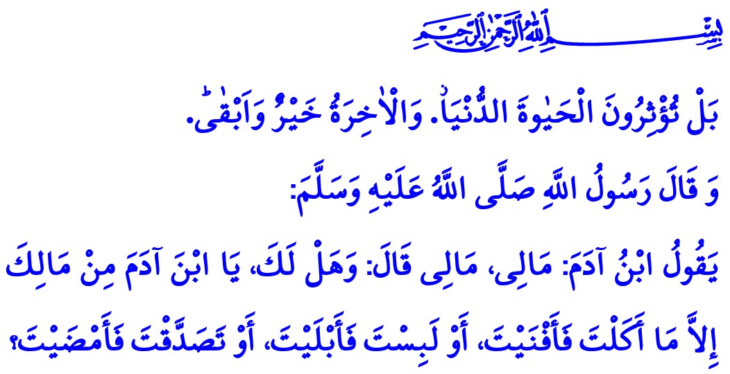 Cenab-ı Hak bizleri bu fani dünyaya imtihan için göndermiştir. Müslüman elbette dünyası için çalışacaktır. Ama ahiretini de ihmal etmeyecektir. Her ne kadar asıl amaç ahiret yurdunu kazanmak olsa da dünya nimetlerinden de meşru şekilde yararlanmak esastır. Yeter ki mümin, elde ettiği imkânların mahkûmu olmasın, imkânlarını Rabbimizin rızasına uygun bir şekilde kullansın. Nitekim Cenâb-ı Hak Kur’an-ı Kerim’de şöyle buyurur: “Allah’ın sana verdiğinden O’nun yolunda harcayarak âhiret yurdunu iste; ama dünyadan da nasibini unutma. Yeryüzünde bozgunculuk çıkarmaya çalışma! Şüphesiz Allah bozguncuları sevmez.”[3]