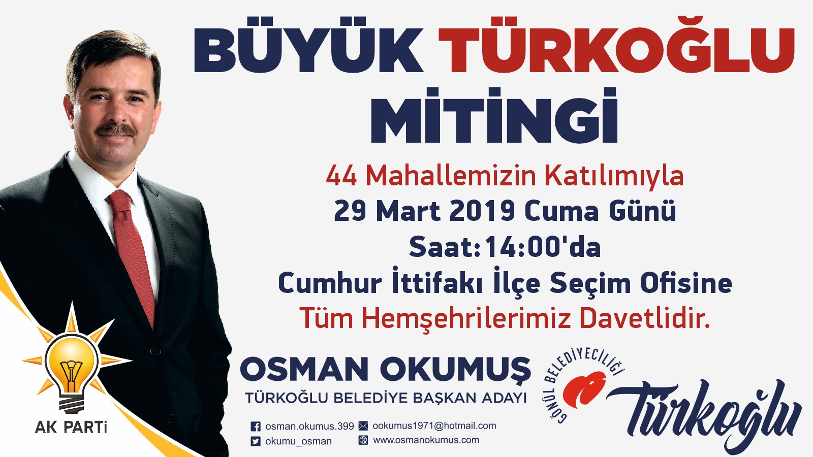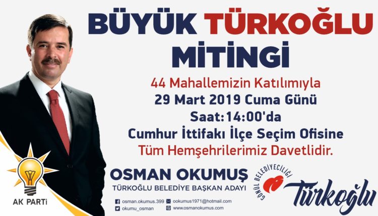 31 Martta düzenlenecek olan yerel seçim çalışmalarını gece gündüz devam ettiren Türkoğlu Belediye Başkanı ve Cumhur İttifakı AK Parti Türkoğlu Belediye Başkan Adayı Osman Okumuş, Türkoğlu’nun 44 mahallesinde miting ve toplantılar gerçekleştirdi. Son olarak da finali, Türkoğlu merkezde geniş katılımlı Büyük Miting düzenleyecek.