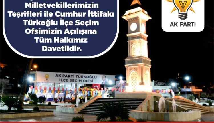 Türkoğlu Belediye Başkanı ve Cumhur İttifakı AK Parti Belediye Başkan Adayı Osman Okumuş’un seçim çalışmalarını yürüteceği, Cumhur İttifakı  AK Parti seçim bürosu 22 Şubat 2019 tarihi Cuma günü saat 13:30 da Millet Meydanı karşısında, Genel Başkan Yardımcısı ve Parti sözcüsü Mahir Ünal ve tüm Milletvekillerinin katılımı ile açılışı gerçekleştirilecektir.