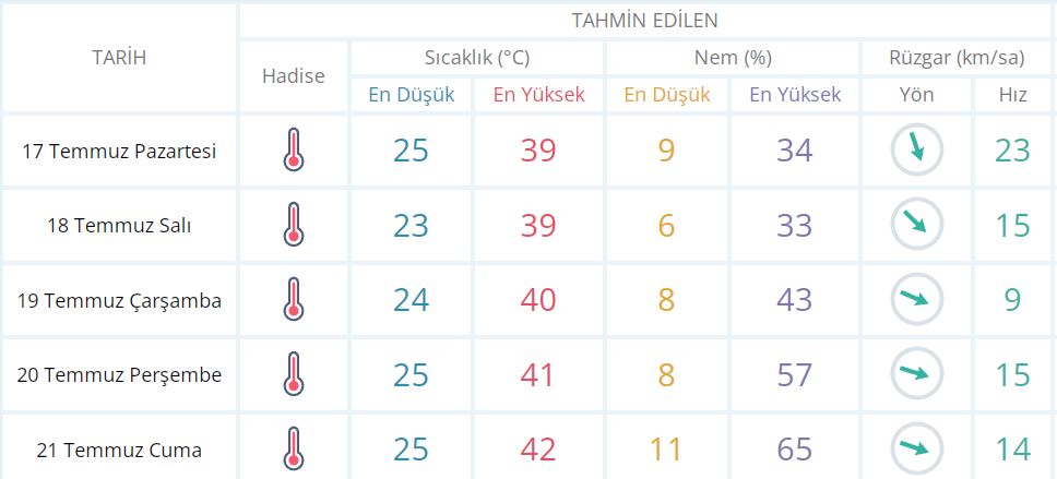 17 Temmuz Pazartesi günü en düşük sıcaklık 25 derece, en yüksek sıcaklık ise 39 derece açık ve sıcak olacak.