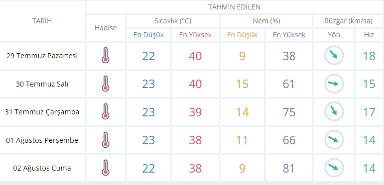 30 Temmuz Salı günü en düşük sıcaklık 23 derece, en yüksek sıcaklık ise 40 derece açık ve sıcak olacak.