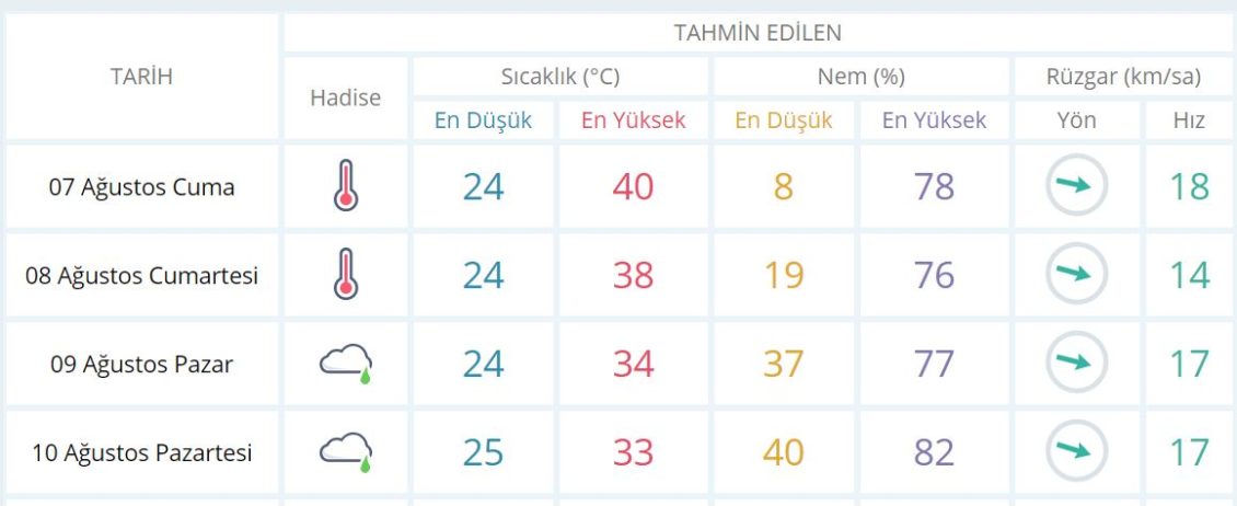 7 Ağustos Cuma günü en düşük sıcaklık 24 derece, en yüksek sıcaklık ise 40 derece açık ve sıcak olacak.