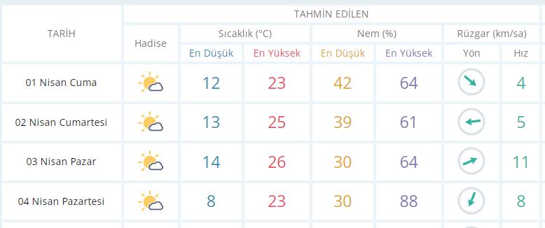 4 Nisan Pazartesi günü en düşük sıcaklık 8 derece, en yüksek sıcaklık ise 23 derece açık az bulutlu olacak.