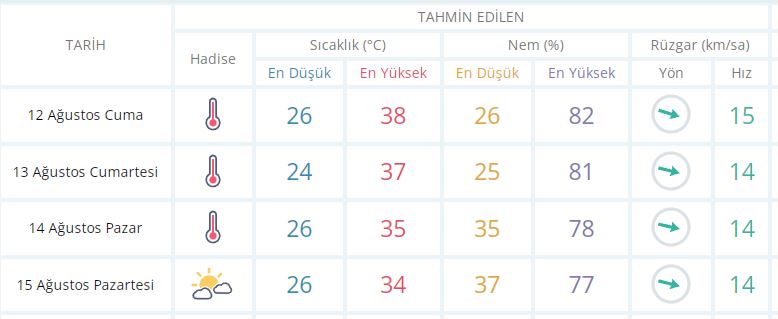 15 Ağustos Pazartesi günü en düşük sıcaklık 26 derece, en yüksek sıcaklık ise 34 derece açık az bulutlu olacak.
