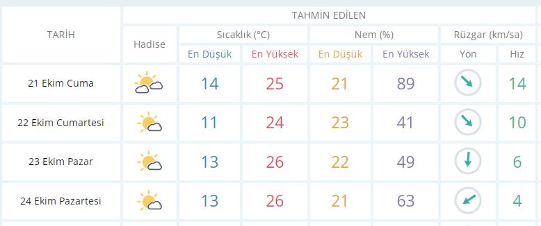 22 Ekim Cumartesi günü en düşük sıcaklık 11 derece, en yüksek sıcaklık ise 24 derece açık az bulutlu olacak.