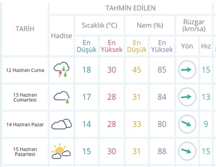 13 Haziran Cumartesi günü en düşük sıcaklık 17 derece, en yüksek sıcaklık ise 28 derece bulutlu olacak.