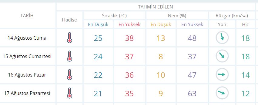 14 Ağustos Cuma günü en düşük sıcaklık 25 derece, en yüksek sıcaklık ise 38 derece açık ve sıcak olacak.