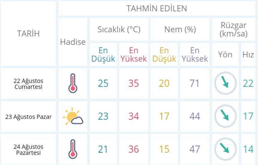 22 Ağustos Cumartesi günü en düşük sıcaklık 25 derece, en yüksek sıcaklık ise 35 derece açık ve sıcak olacak.