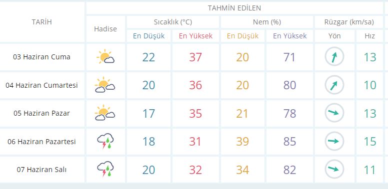 5 Haziran Pazar günü en düşük sıcaklık 17 derece, en yüksek sıcaklık ise 35 derece parçalı bulutlu olacak.