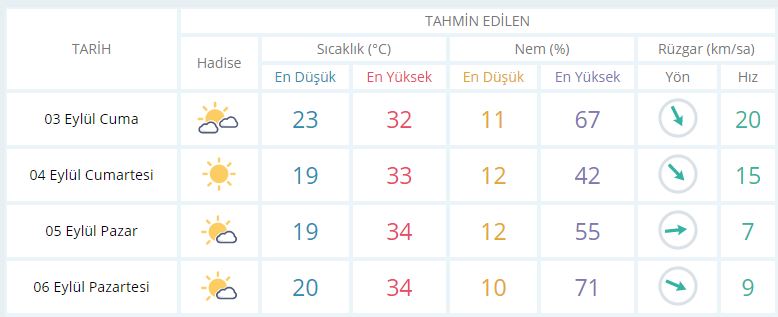 4 Eylül Cumartesi günü en düşük sıcaklık 19 derece, en yüksek sıcaklık ise 33 derece açık ve sıcak olacak.