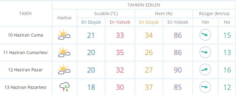 11 Haziran Cumartesi günü en düşük sıcaklık 21 derece, en yüksek sıcaklık ise 35 derece parçalı bulutlu olacak.