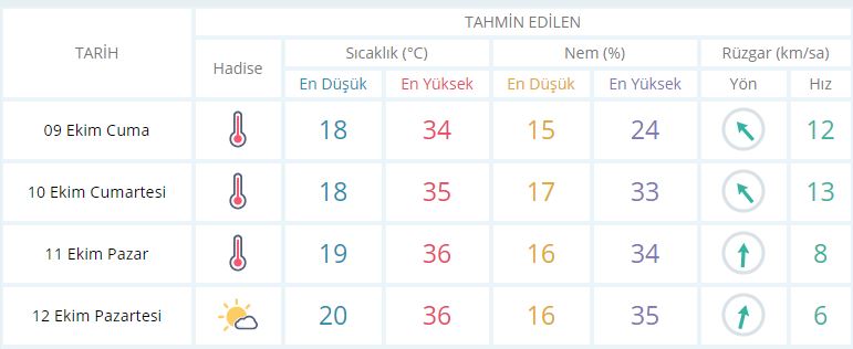 10 Ekim Cumartesi günü en düşük sıcaklık 18 derece, en yüksek sıcaklık ise 34 derece açık ve sıcak olacak.