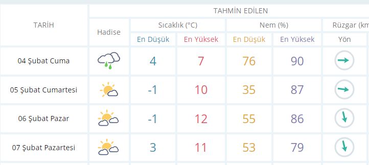5 Şubat Cumartesi günü en düşük sıcaklık 4 derece, en yüksek sıcaklık ise 7 derece yağmurlu olacak.