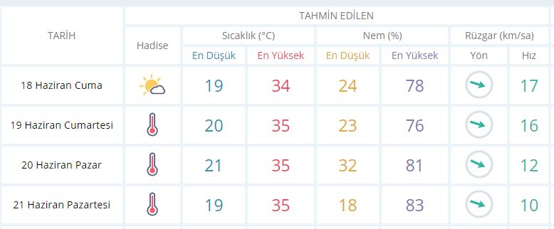 19 Haziran Cumartesi günü en düşük sıcaklık 20 derece, en yüksek sıcaklık ise 35 derece açık ve sıcak olacak.